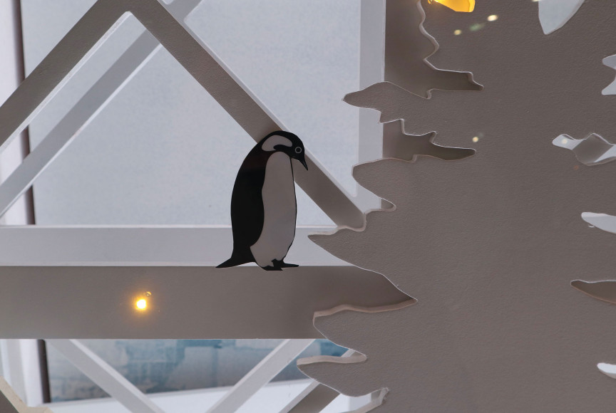 Notre décor, traité en deux dimensions par découpe numérique, est mis en lumière selon un cycle de quelques minutes. Les ambiances colorées se succèdent entre nuit et jour et magnifient éléments de décor et maquettes. La grande roue, motorisée, donne vie au diorama.