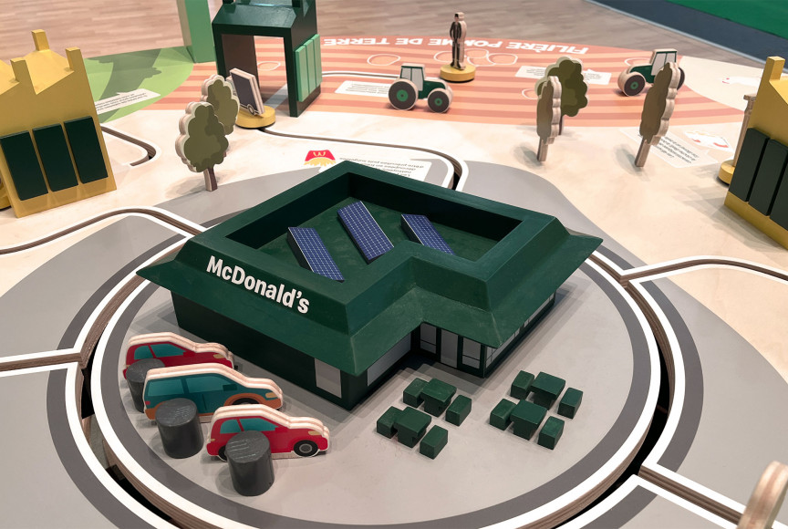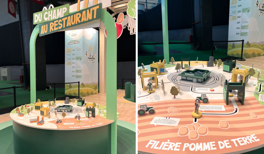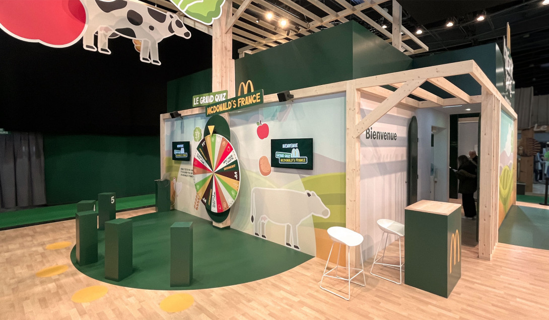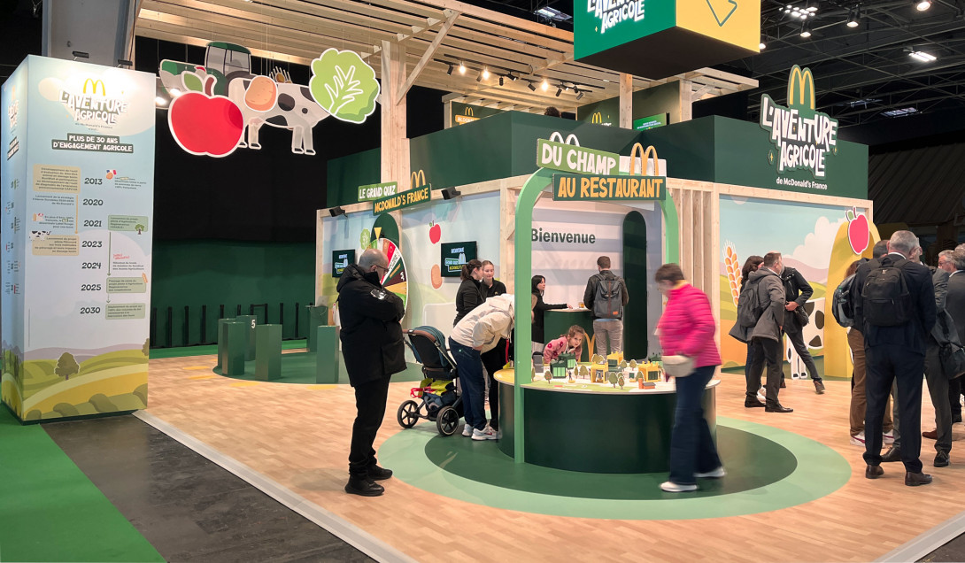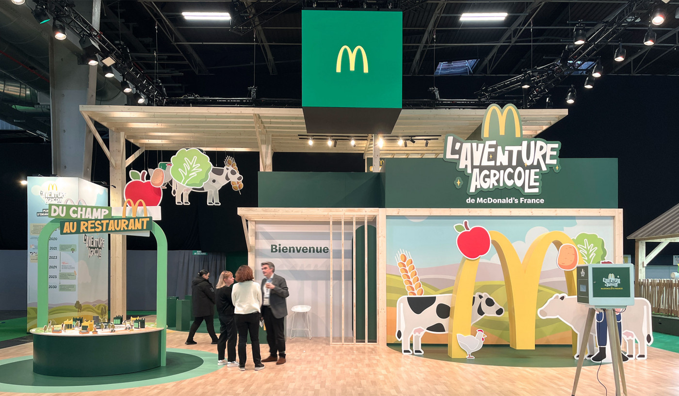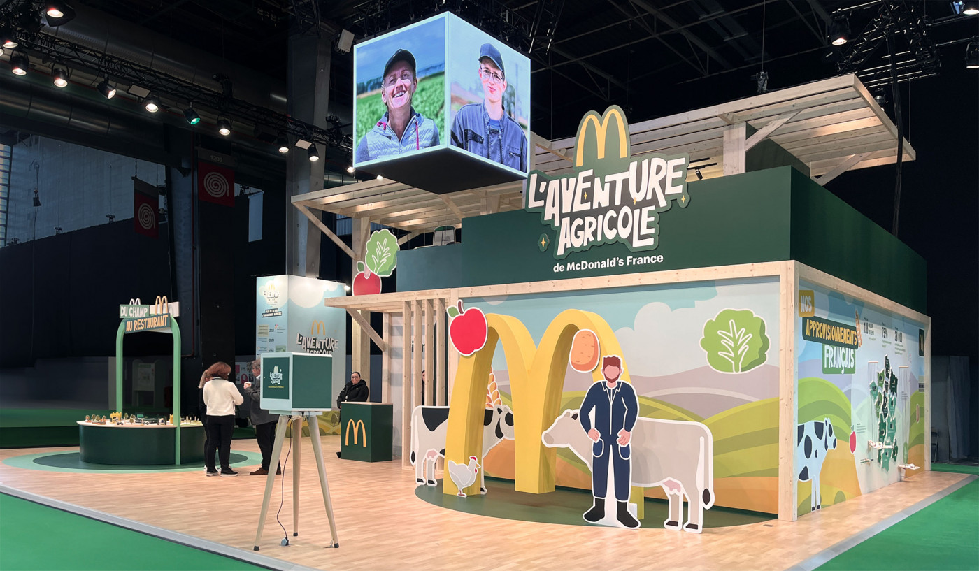 Le stand McDonald au Salon International de l'Agriculture 2026 est imaginé en référence à l'architecture agricole. Il organise à 180° des animations familiales en libérant de larges espaces pour accueillir un public nombreux.