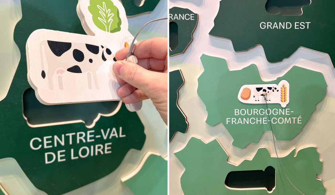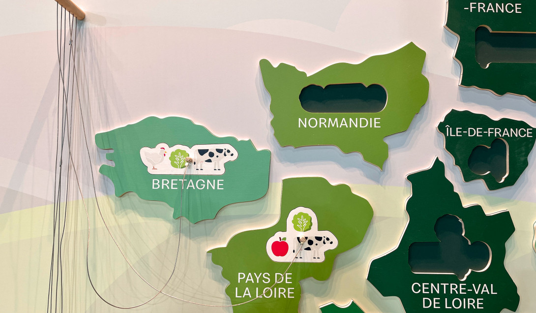 Pour donner à voir le nombre de producteurs agricoles en contrat avec McDonald nous avons imaginé une carte puzzle. À chaque région est associée les produits qui y sont cultivés.