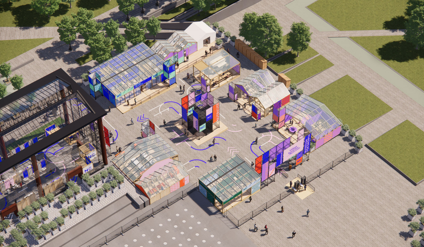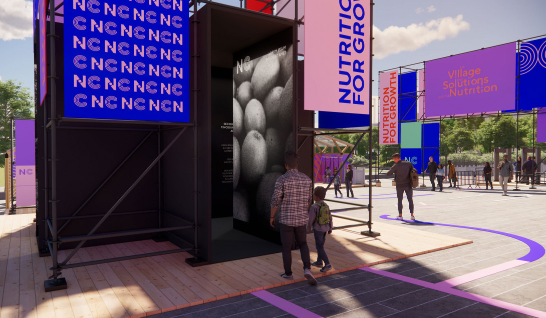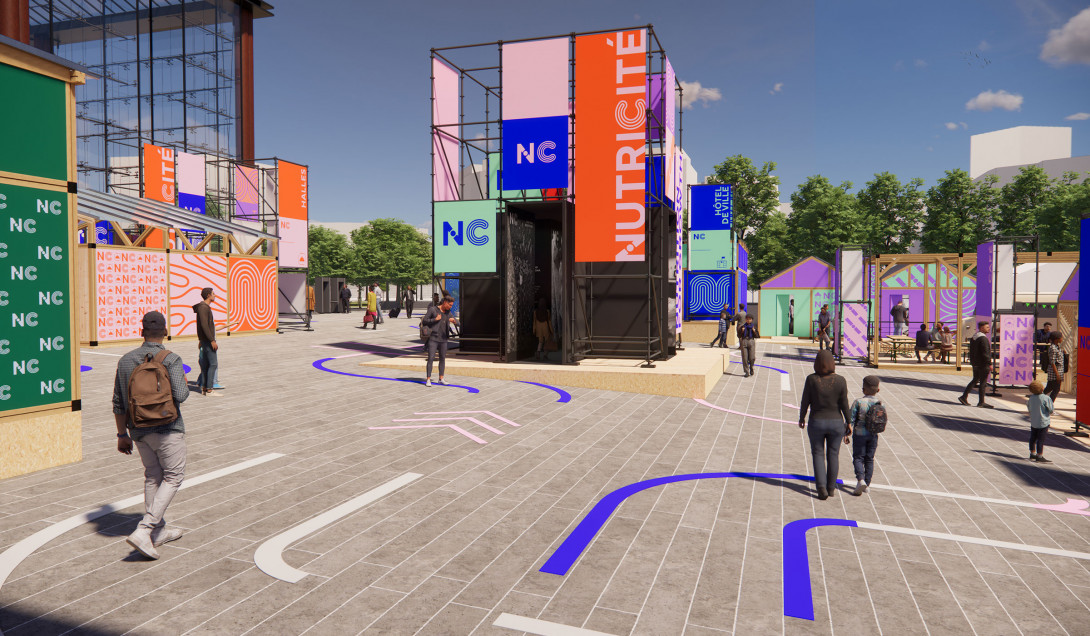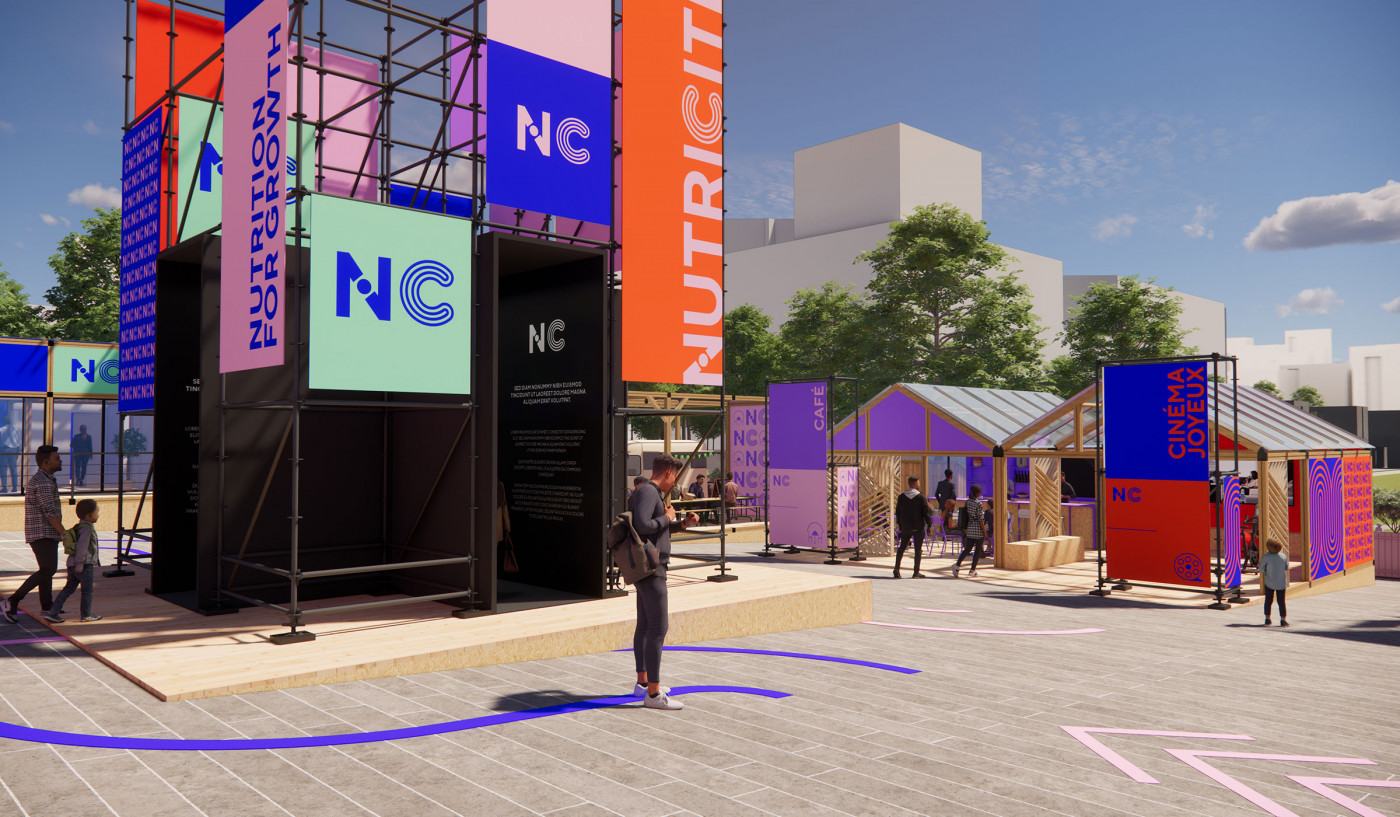 Pour mettre en place une scénographie à l'échelle du parc André Citroën du village des solutions pour la nutrition, organisé par l'Agence Française de Développement, nous imaginons une ville graphique à partir de structures échafaudages.