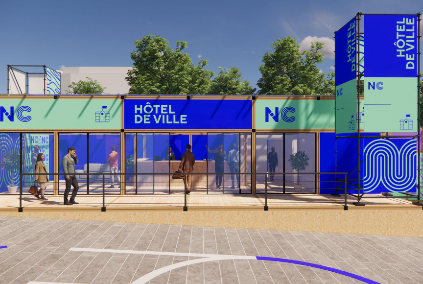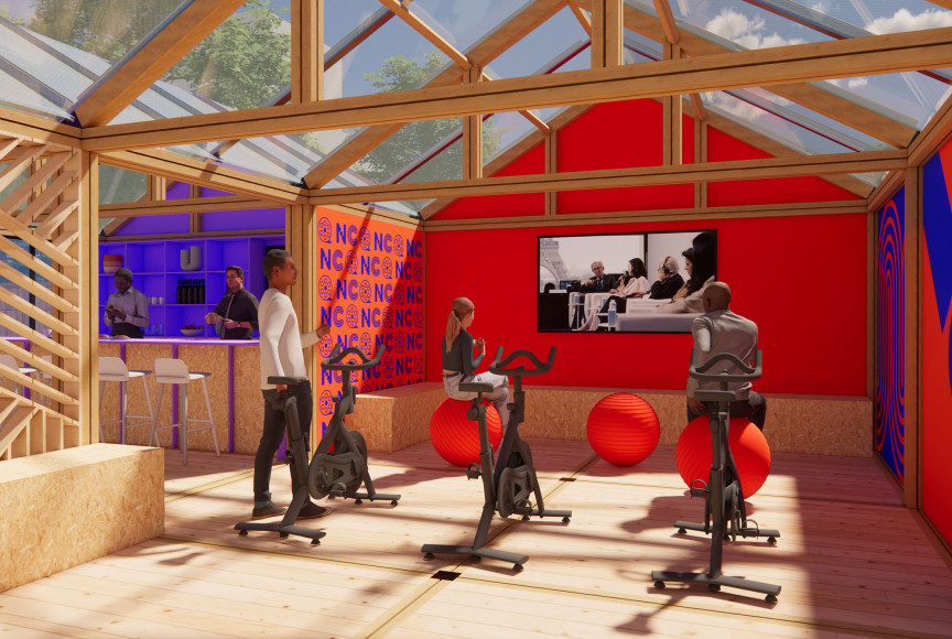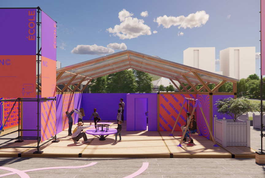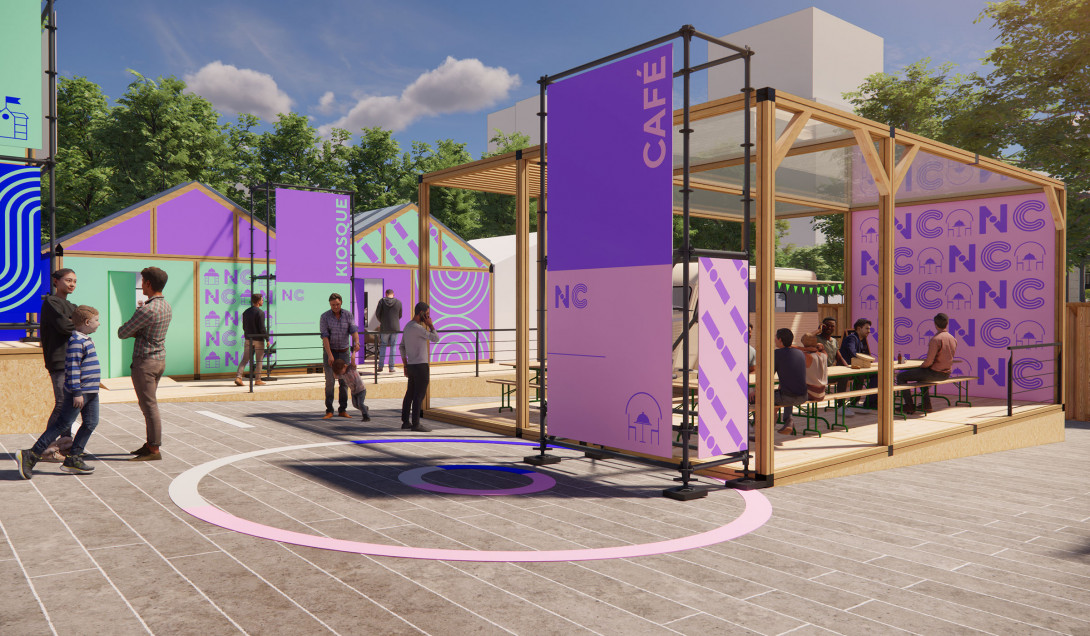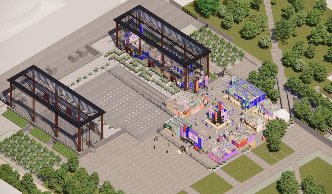 Pour mettre en place une scénographie à l'échelle du parc André Citroën du village des solutions pour la nutrition, organisé par l'Agence Française de Développement, nous imaginons une ville graphique à partir de structures échafaudages.